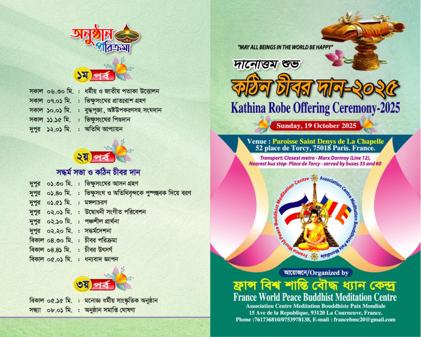 ধর্মীয় ভাবগাম্ভীর্যের মধ্য দিয়ে ফ্রান্সের  বিশ্ব শান্তি বৌদ্ধ ধ্যান কেন্দ্রের   দানোত্তম শুভ কঠিন চীবর দান আগামী  ১৯ অক্টোবর রোববার  প্যারিসের টরসির  প্যারোইস সেন্ট ডেনিস দে লা চ্যাপেল মিলনায়তনে অনুষ্ঠিত হবে।