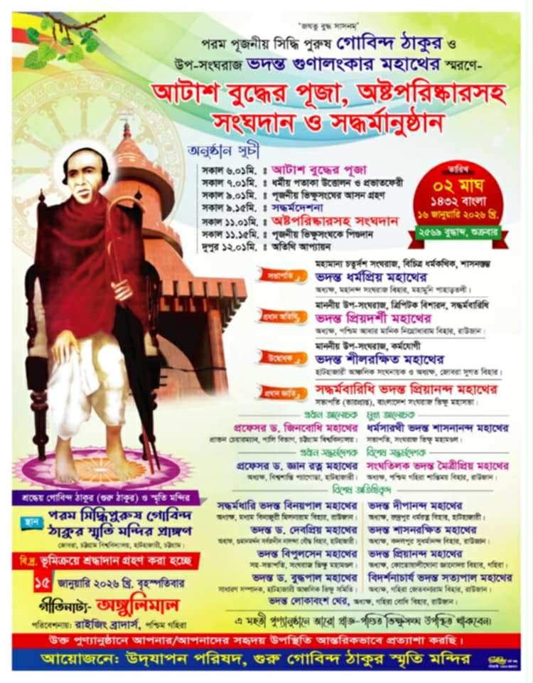 সিদ্ধিপুরুষ গোবিন্দ ঠাকুর ও উপসংঘরাজ গুনালংকার মহাথের স্মরণে সদ্ধর্মানুষ্ঠান আগামী ১৬ জানুয়ারি শুক্রবার সকালে হাটহাজারীর জোবরা গ্রামে সিদ্ধিপুরুষ গোবিন্দ ঠাকুর স্মৃতি মন্দির প্রাঙ্গণে অনুষ্ঠিত হবে।