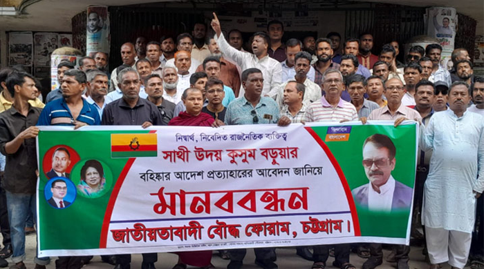 বিএনপি থেকে উদয় কুসুম বড়ুয়ার বহিষ্কারাদেশ প্রত্যাহারের দাবিতে মানববন্ধন