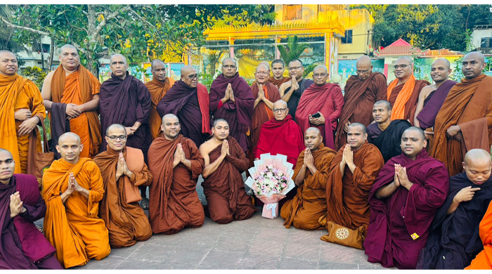 বাংলাদেশ সংঘরাজ ভিক্ষু মহাসভার পক্ষ থেকে নব মনোনীত সংঘরাজ শাসনস্তম্ভ ধর্মপ্রিয় মহাথেরকে অবহিত করণ পত্র প্রদান, পুষ্পস্তবক দিয়ে শ্রদ্ধা জ্ঞাপন