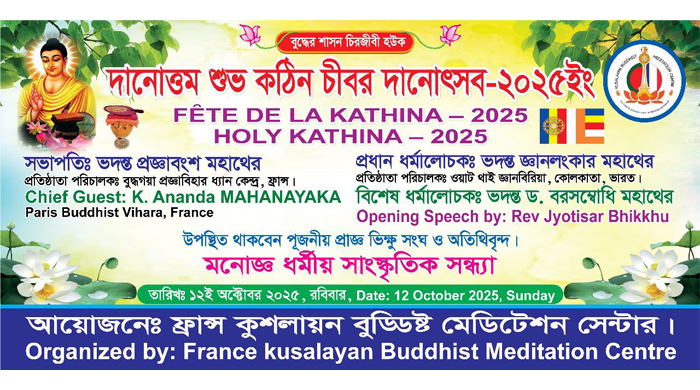 ধর্মীয় ভাবগাম্ভীর্যের মধ্য দিয়ে ফ্রান্সের কুশলায়ন বুড্ডিস্ট মেডিটেশন সেন্টারের দানোত্তম শুভ কঠিন চীবর দান আগামীকাল রোববার (১২ অক্টোবর) বিহারের নিকটবর্তী